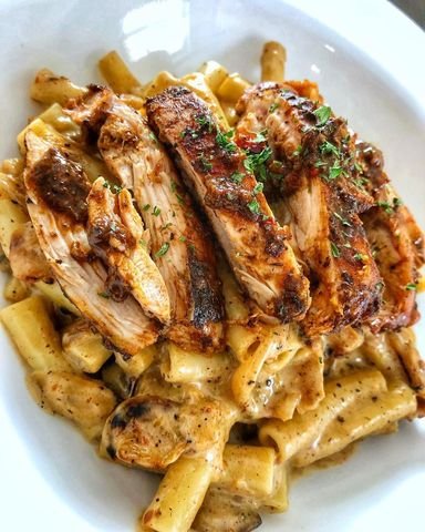 Penne pasta tossed in a jerked chicken alfredo sauce