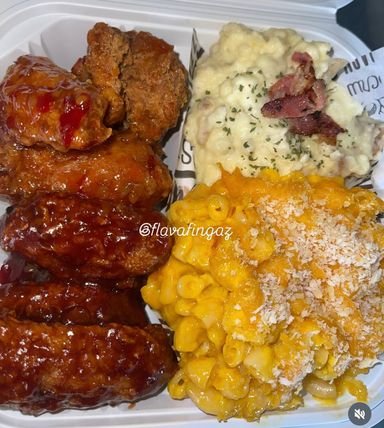 Crispy (bbq, sweet chili or honey sriracha) wings paired with mashed potatoes topped with cheese and bacon and creamy mac n’ cheese