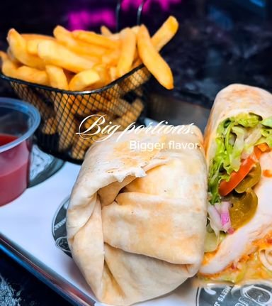 Beef wrap: Ground beef with crunchy lettuce, tomato, bacon, melted cheese and a mix of jalapenos, bell peppers & onion wrapped in a soft tortilla.